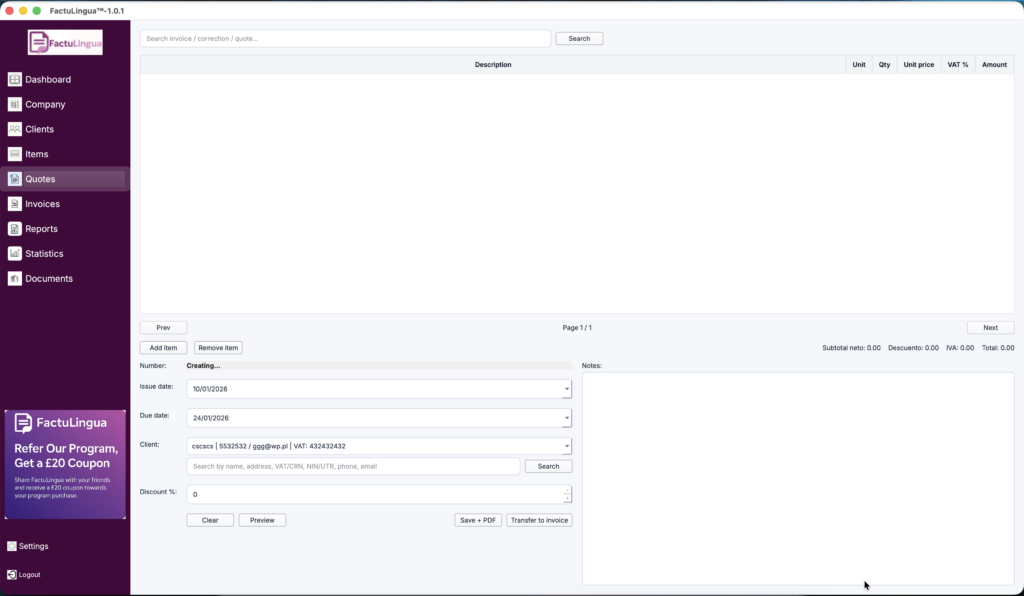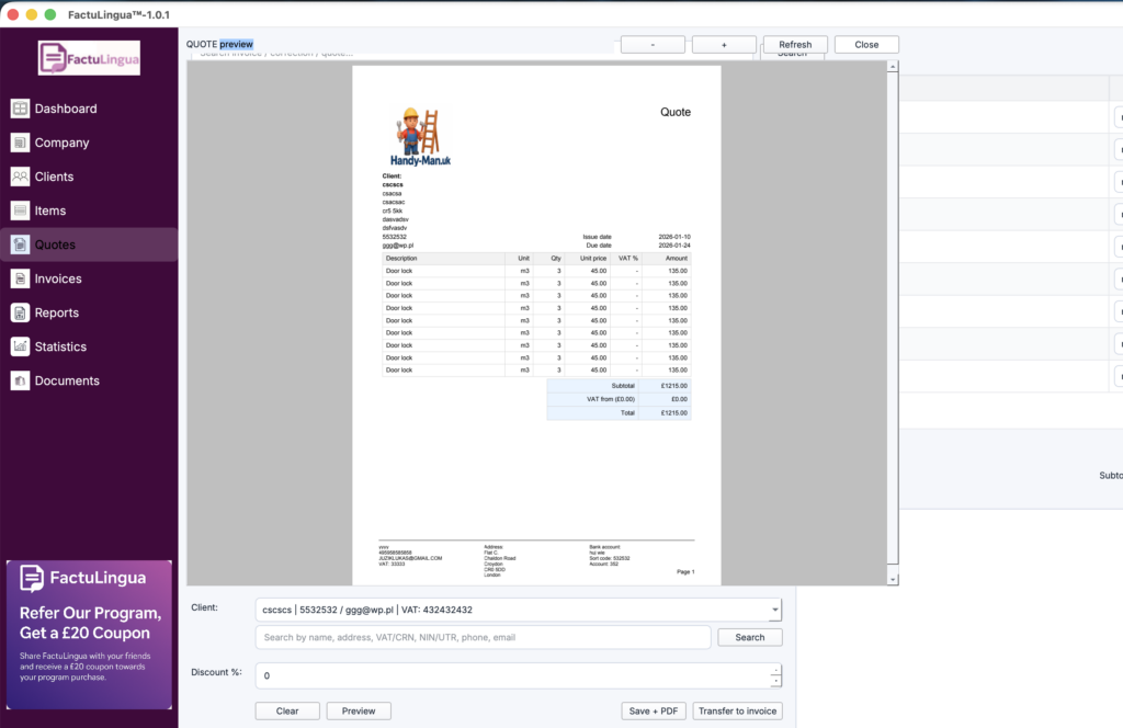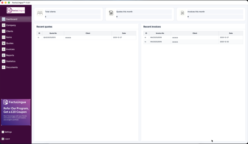 You can work in your own language while the system generates professional English PDFs — ready for UK clients, accountants and HMRC.